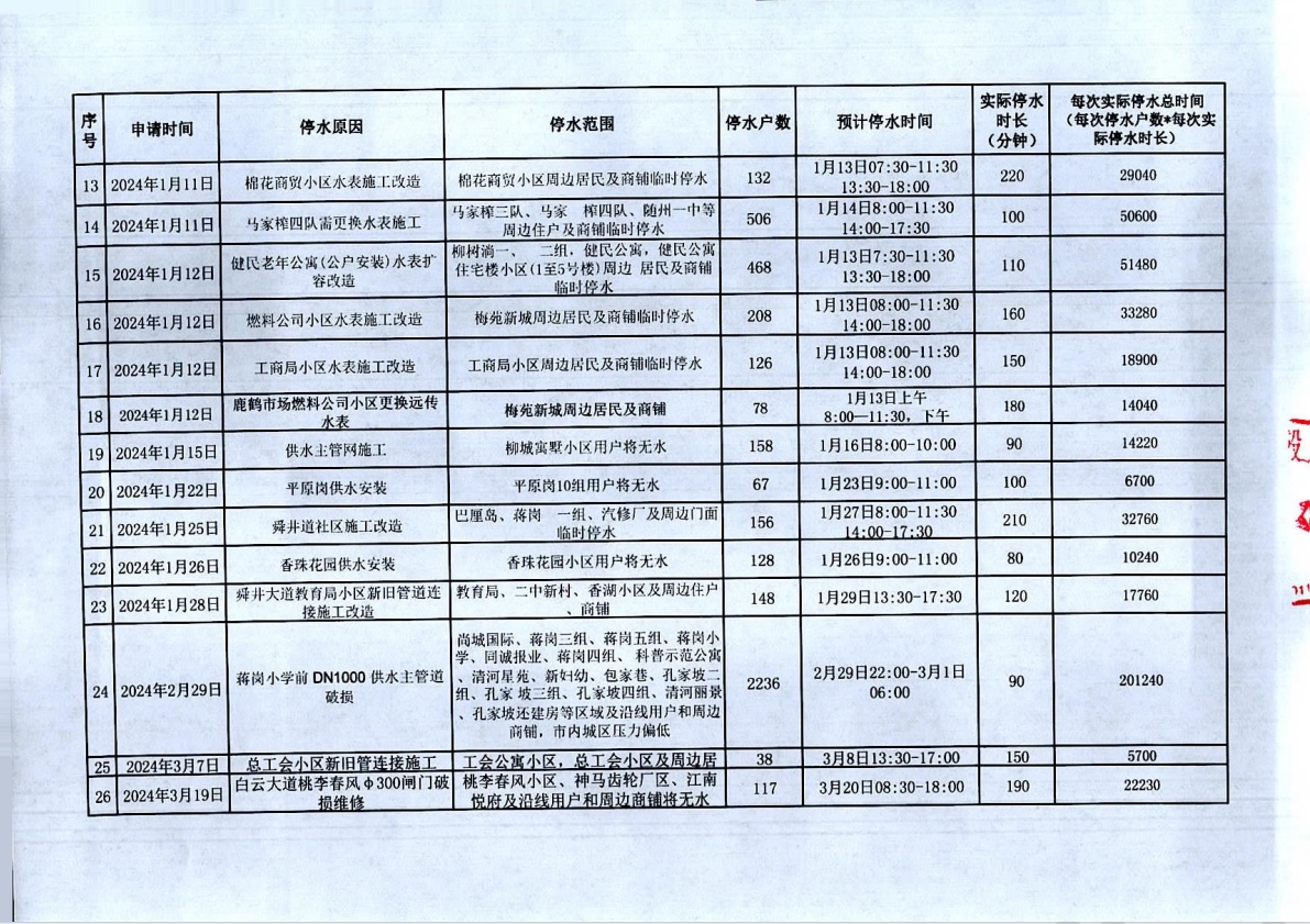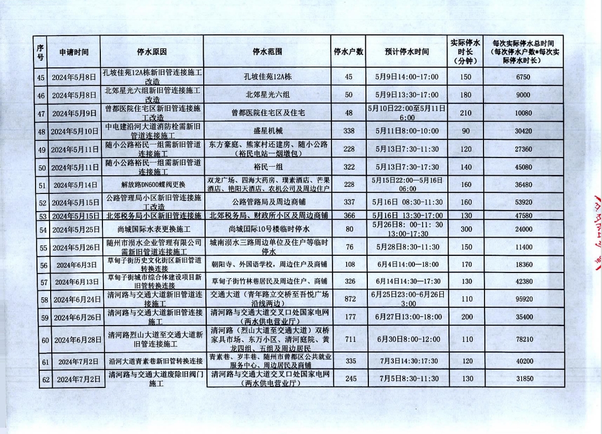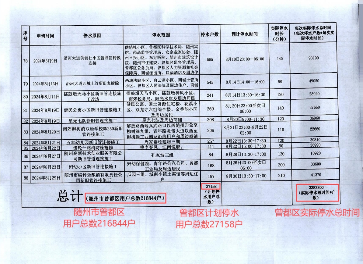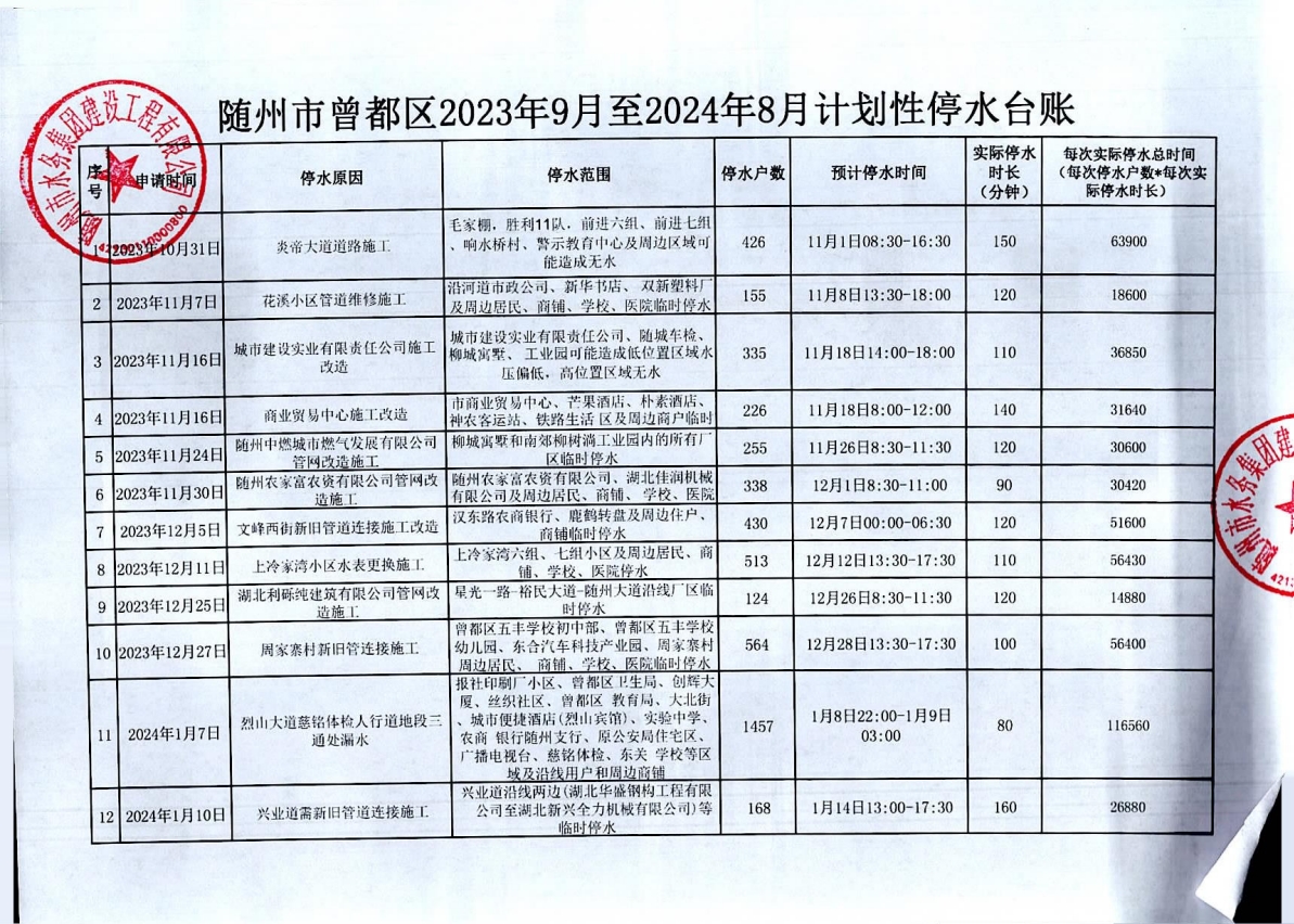 隨州市曾都區(qū)2023年9月至2024年8月計(jì)劃性停水資料